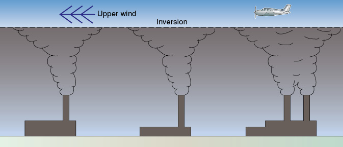Figure 18-2 Reduced visibility and smooth flying conditions beneath the inversion, and possible windshear passing through it.