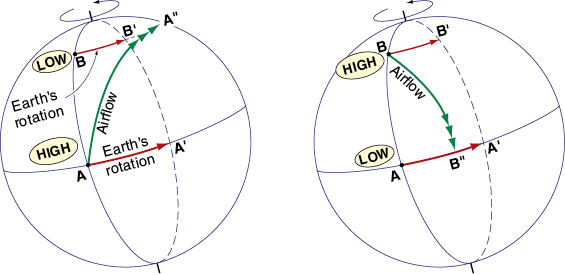 If the parcel of air was being accelerated in a southerly direction from a high pressure area in the Northern Hemisphere toward a low near the equator, the earth’s rotation toward the east would “get away from it” and so the air flow would appear to turn right also — A having moved to A', but the airflow having only reached B' to the west.