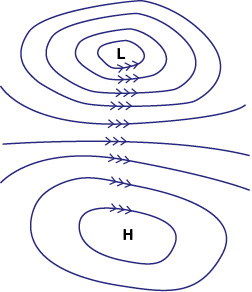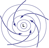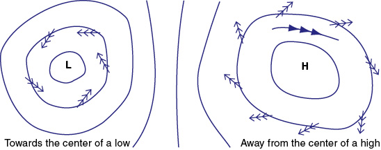 Figure 17-4 Winds flow clockwise around a high and counterclockwise around a low in the Northern Hemisphere.