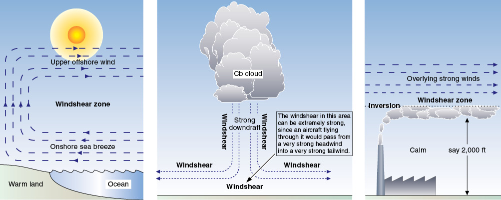 - The term low-level windshear is used to specify any windshear occurring along the final approach path prior to landing, along the runway and along the takeoff/initial climb-out flight path. Windshear near the ground (below about 3,000 feet) is often the most critical in terms of safety for the airplane. Windshear is quite common when there is a low-level temperature inversion.