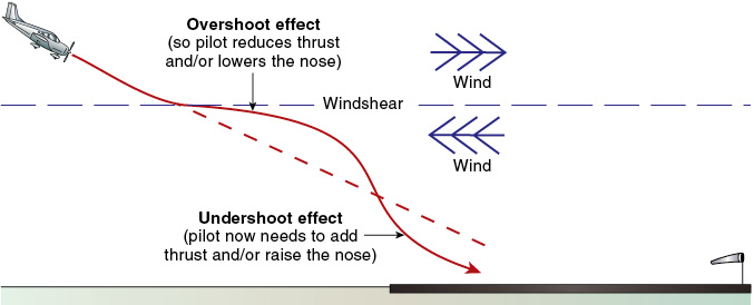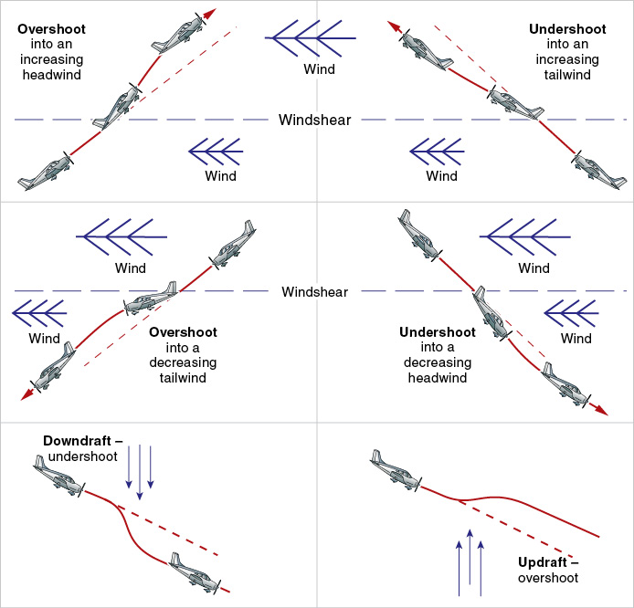 Undershoot effect may result from flying into a decreasing headwind, an increasing tailwind, from a headwind into a tailwind, or into a downdraft. Undershoot effect is sometimes referred to as a performance-decreasing windshear, since it causes a loss of airspeed and/or altitude.