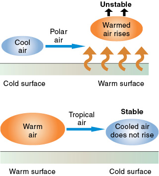 Figure 17-12 Polar air warms and becomes unstable (top) and tropical air cools and becomes stable (bottom).