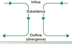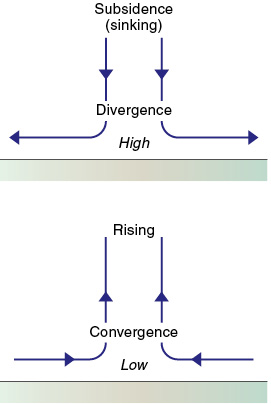 An air mass influenced by the divergence of air flowing out of a high pressure system at the earth’s surface will slowly sink (known as subsidence) and become warmer, drier and more stable. An air mass influenced by convergence as air flows into a low pressure system at the surface will be forced to rise slowly, becoming cooler, moister and less stable.