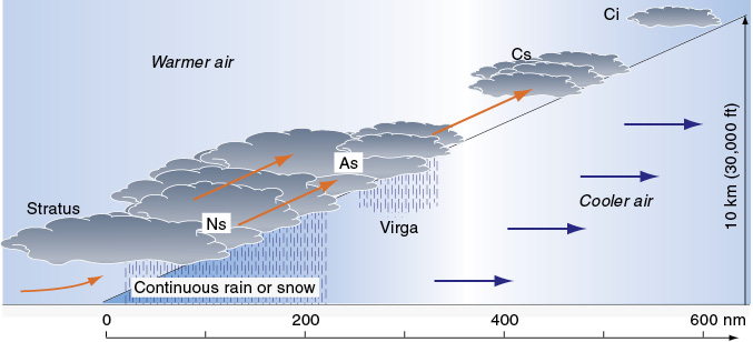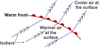If two air masses meet so that the warmer air replaces the cooler air at the surface, a warm front is said to exist. The boundary at the earth’s surface between the two air masses is represented on a weather chart as a line with semicircles pointed in the direction of movement.