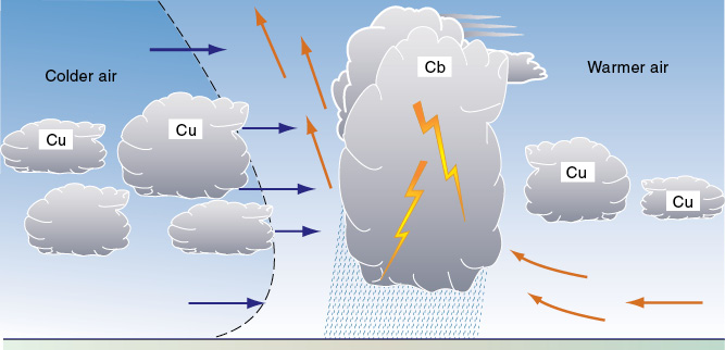 Flying through a cold front may require diversions to avoid weather. There may be thunderstorm activity, violent winds (both horizontal and vertical) from cumulonimbus clouds, squall lines, windshear, heavy showers of rain or hail, and severe turbulence. In some instances, icing could be a problem. Visibility away from the showers and the clouds may be quite good, but it is still a good idea for a pilot to consider avoiding the strong weather activity that accompanies many cold fronts. A squall line may form ahead of the front.