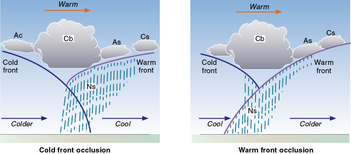 Flight through an occluded front may involve encountering intense weather, as both a cold front and a warm front are involved, with a warm air mass being squeezed up between them. The wind direction will be different on either side of the front.