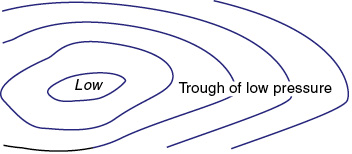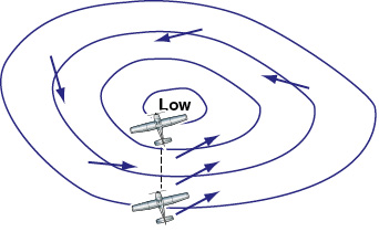 A depression or low is a region of low pressure at the surface, the pressure gradually rising as you move away from its center. A low is depicted on a weather chart by a series of concentric isobars joining places of equal sea level pressure, with the lowest pressure in the center. In the Northern Hemisphere, winds circulate counterclockwise around a low. Flying toward a low, an airplane will experience right drift.