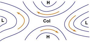 The area of almost constant pressure (and therefore indicated by a few widely spaced isobars) that exists between two highs and two lows is called a col. It is like a “saddle” on a mountain ridge. Light winds are often associated with cols, with fog a possibility in winter and high temperatures in summer possibly leading to showers or thunderstorms.
