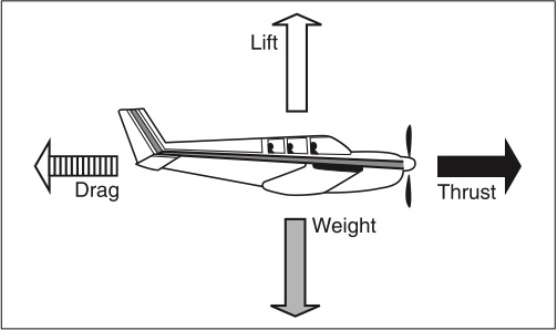 Four aerodynamic forces are considered to be basic because they act upon an aircraft during all flight maneuvers: there is the downward-acting force called weight which must be overcome by the upward-acting force called lift; and there is the rearward-acting force called drag, which must be overcome by the forward-acting force called thrust. See Figure 1-11.