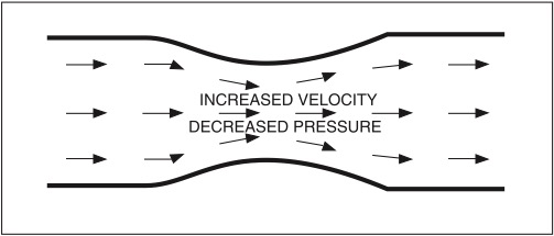As the velocity of a fluid (gas or liquid) increases, its pressure decreases. This is known as Bernoulli’s principle. See Figure 1-12.