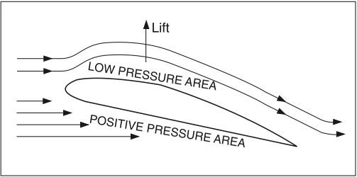 Lift is the result of a pressure difference between the top and the bottom of the wing. A wing is designed to accelerate air over the top camber of the wing, thereby decreasing the pressure on the top and producing lift. See Figure 1-13.