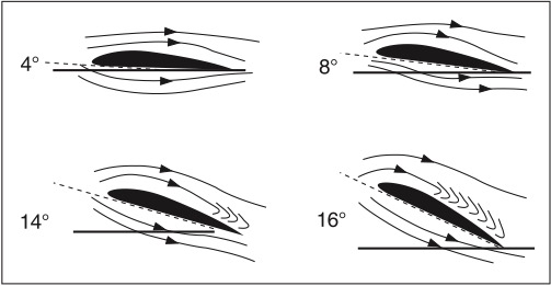 As the angle of attack is increased (to increase lift), the air will no longer flow smoothly over the upper wing surface but instead will become turbulent or “burble” near the trailing edge. A further increase in the angle of attack will cause the turbulent area to expand forward. At an angle of attack of approximately 18° to 20° (for most wings), turbulence over the upper wing surface decreases lift so drastically that flight can not be sustained and the wing stalls. See Figure 1-24.