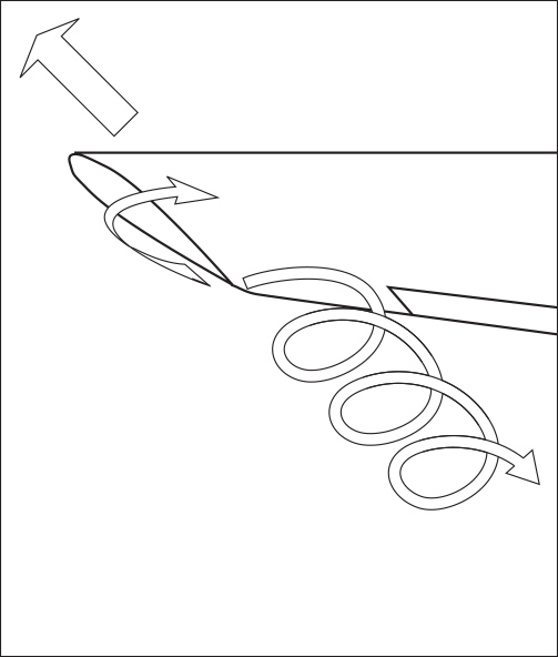 Wing-tip vortices are a by-product of lift. When a wing is flown at a positive angle of attack, a pressure differential is created between the upper and lower wing surfaces, and the pressure above the wing will be lower than the pressure below the wing. In attempting to equalize the pressure, air moves outward, upward, and around the wing tip, setting up a vortex which trails behind each wing. See Figure 1-27.