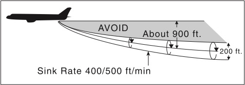Vortices generated by large aircraft in flight tend to sink below the flight path of the generating aircraft. A pilot should fly at or above the larger aircraft’s flight path in order to avoid the wake turbulence created by the wing-tip vortices. See Figure 1-28.