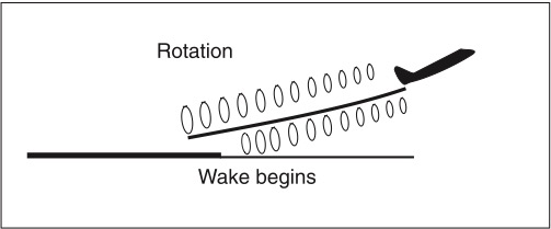 On takeoff, lift off should be accomplished prior to reaching the rotation point of a preceding large aircraft; the flight path should then remain upwind and above the preceding aircraft’s flight path. See Figure 1-30.